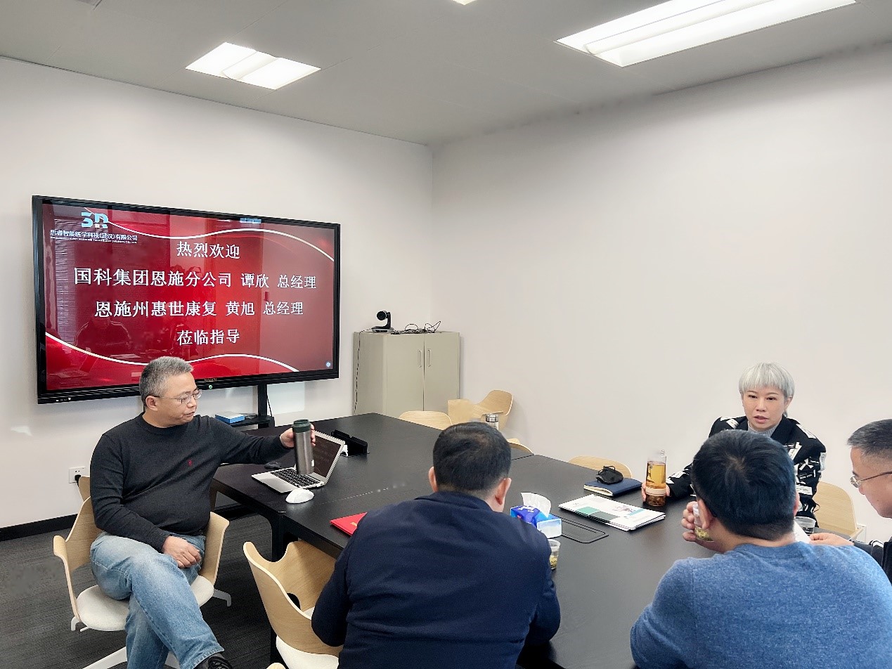 恩施位于湖北省西南部,清江中上游,常住人口超80万,有包括汉族在内共计45个民族。近年随着恩施整体经济、生活质量不断提高,恩施人民对医疗水平的要求也约来越高,这也促进了以恩施州中心医院为代表的各级地方医院正迈向“微创化、精准化”等高水平现代诊疗体系。因缘际会,随着思睿智能医学科技(武汉)有限公司(以下简称我司)今年的主打产品 - “特固”系列3D打印外固定支具备受市场关注,需求与口碑稳步提升的发展状态下,由国科瑞泰(湖北)医疗科技有限公司恩施分公司、恩施州惠世康复辅具服务有限公司以及恩施州中心医院组成的考察组一行于2022年12月12日来访思睿公司,在我司营销总监任芙蓉、产品总监周华的热情接待下深入考察了我司发展历程与产品详解。