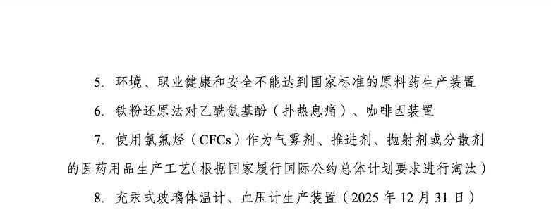 淘汰类主要是不符合有关法律法规规定,严重浪费资源、污染环境,安全生产隐患严重,阻碍实现碳达峰碳中和目标,需要淘汰的落后工艺技术、装备及产品。医药行业中,充汞式玻璃体温计、血压计生产装置(2025年12月31日)新增加至淘汰类目录。