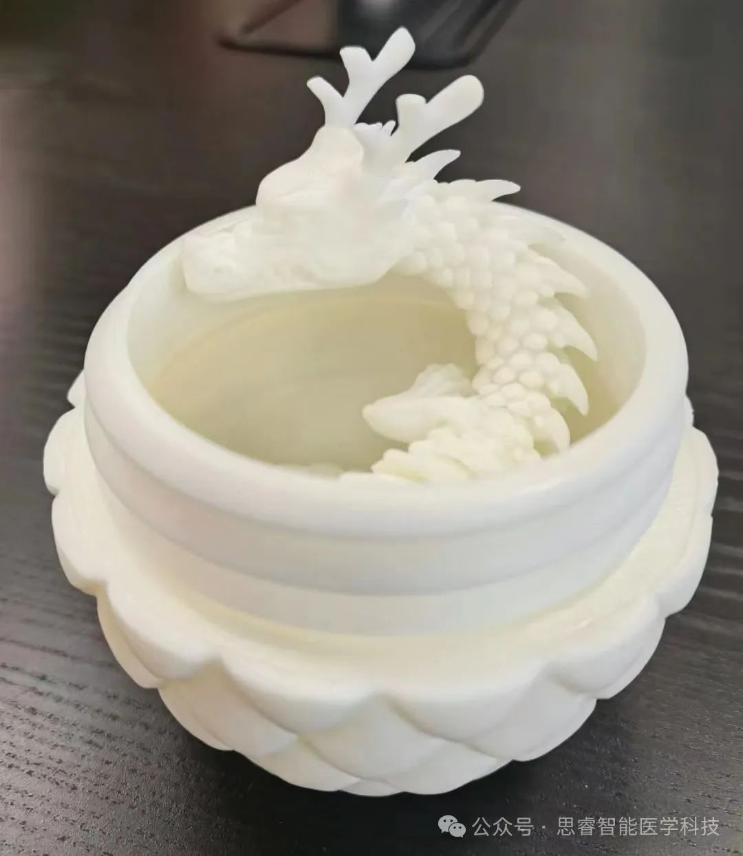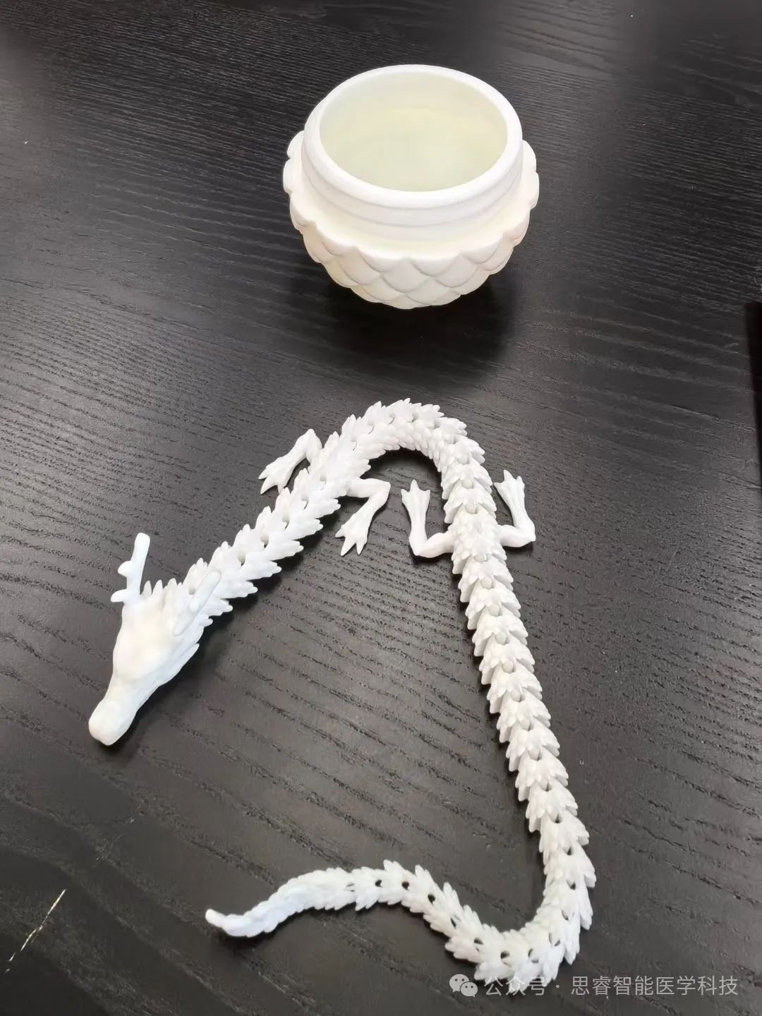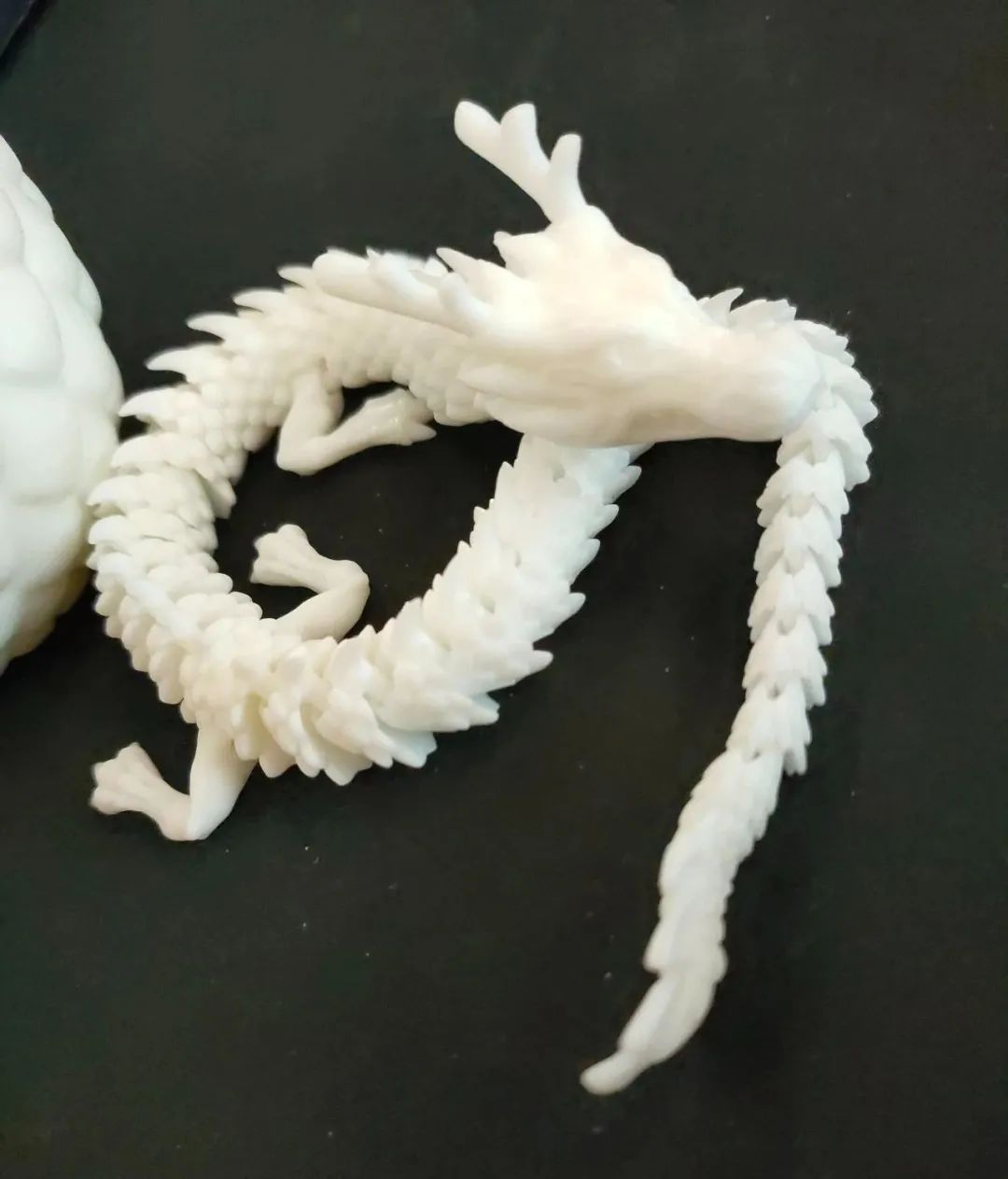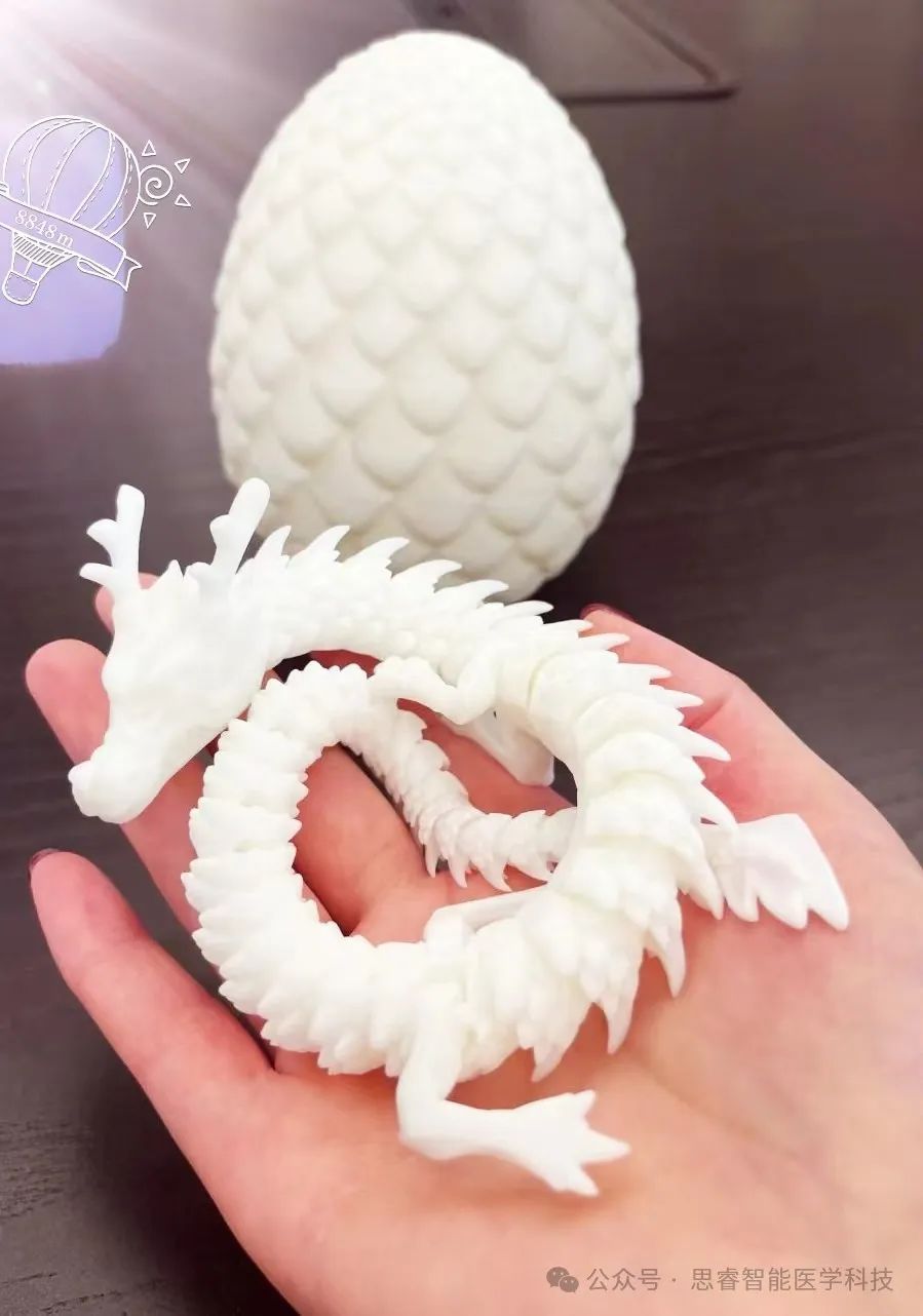 这条通体洁白如玉的小龙以树脂为原料,通过光固化增材制造,一体成型,表情威严,关节灵动。
