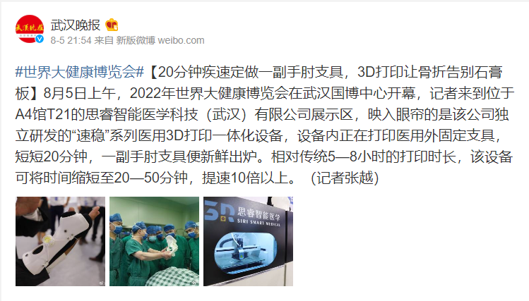 2022年8月5-7日,世界大健康博览会(简称“健博会”)在武汉国际博览中心拉开序幕。近千家参展商线上线下同步参展,带来大健康领域最新产品、技术和成果;国内外专家共聚一堂,展望大健康产业发展。此届健博会设置有6个室内展馆和1个场外馆,面积约7万平米,思睿智能医学科技(武汉)有限公司在A4馆T21展台搭建了以“智能制造突破传统 医工结合开创未来”为主题的特色展示区,携术前规划、术中辅助、术后康复等专业医疗主打新品,为消费者耳目一新地展现了3D打印对应临床医疗的不同应用阶段与现状。